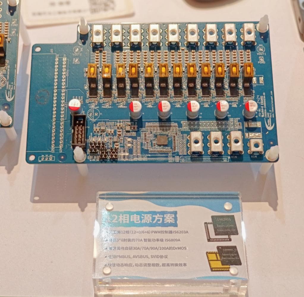 The IS6203A shared on-site is a dual-channel, 12-phase PWM controller with multiple digital interface protocols, supporting PMBus, AVSBus, and SVID protocols. Each phase can achieve a switching frequency of 200kHz to 3MHz. Utilizing IVS's patented TCOT™ control algorithm, it enables the fast transient dynamic response and refined power distribution and control strategies required by xPUs. It can be paired with self-developed 30A/70A/90A/100A DrMOS. Through process optimization, it exhibits superior conversion efficiency and dynamic load adaptability, achieving a balance between power density and size.