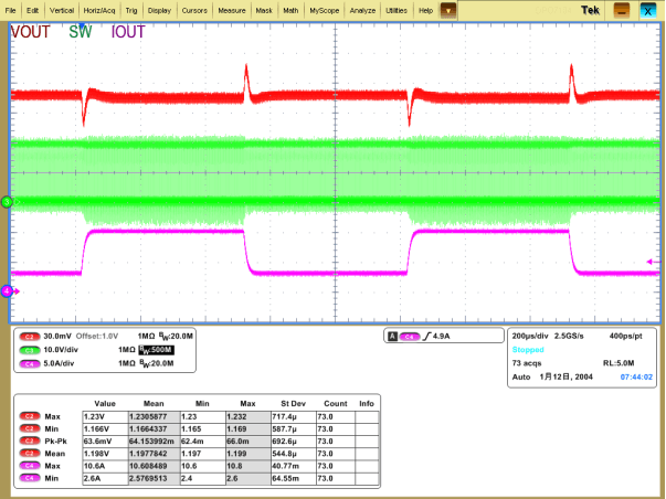 Load Transient: VIN=19V VOUT=1.2V, LOAD 3A~10A 1A/us, PKPK of VOUT=66mV